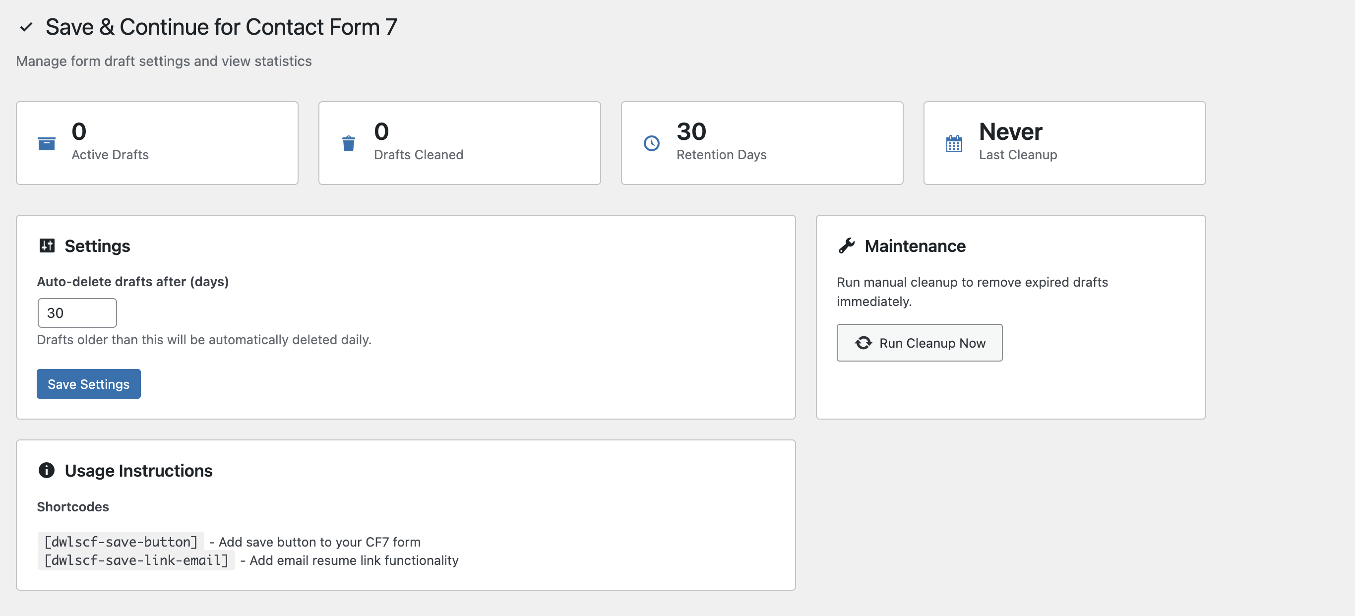 You can configure the retention period in Settings Dwlscf Save & Continue. Default is 30 days. Expired drafts are automatically cleaned up daily, or you can run manual cleanup.